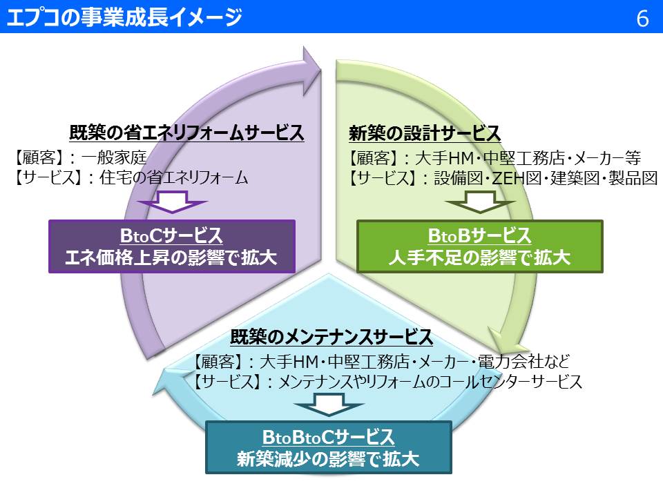 まず、弊社の既存事業であります設備設計サービスについては、マーケットは新築住宅で、お客様は大手ハウスメーカー様を中心に、中堅ビルダーや機器メーカーになり、ビジネスモデルはBtoB、事業環境は人手不足や働き方改革で、BPO(ビジネス・プロセス・アウトソーシング)企業(=エプコ)への業務委託の拡大が見込まれると考えております。