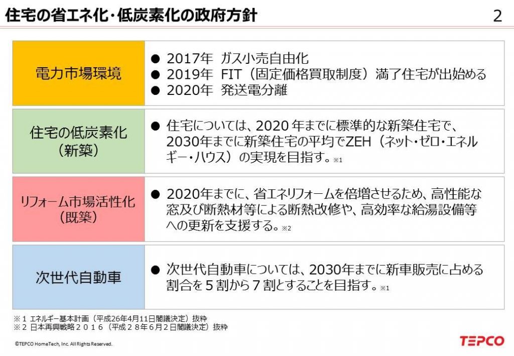 表にも記載しておりますが、政府も住宅の低炭素化とリフォーム市場の活性化に向けた様々な施策を打ち出しておりますので、本日は、個別の政府方針とTEPCOホームテックの省エネ事業の関わりについてご説明させて頂きます。