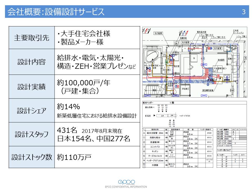 弊社の設計サービスの特徴は、住宅設備の設計から現場で必要な設備部材を予め工場でプレファブ化するための部材加工情報の作成、および設備工事費の積算まで、一気通貫で提供している点で、低層住宅(2階建て、3階建の戸建て住宅やアパート)の給排水設備工事での設計シェアは約14%になります。