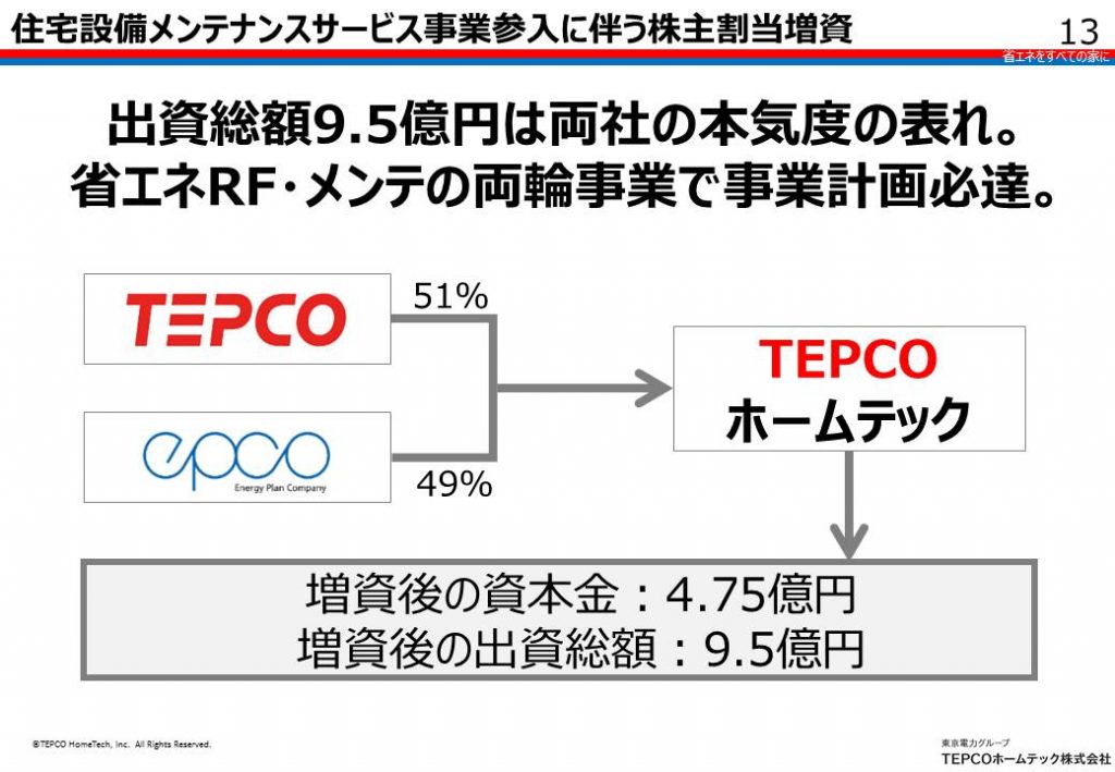 また、今回の株主割当増資により、TEPCOホームテックの資本金は4.75億円(出資総額9.5億円)となりました。