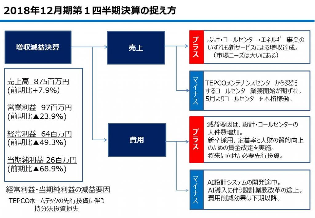 経常利益は64百万円(前年同期比▲43.9%)という結果で、減益の主な要因は、持分法投資損失33百万円の発生(主にTEPCOホームテック)によるものです。