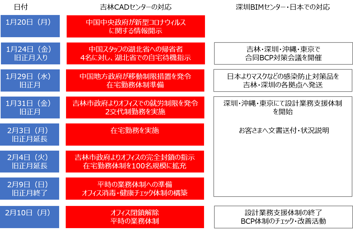 当社が行いましたBCP対策としては、吉林CADセンタースタッフの在宅勤務体制の構築に加え、深圳BIMセンター・沖縄設計センター・東京設計センターにて設計業務の支援体制(拠点間連携)を整え、2月14日までには平時の設計業務量を確保することができました。