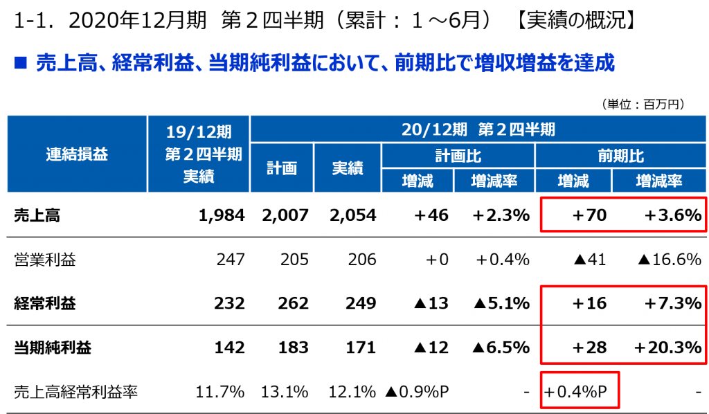2020年12月期第2四半期業績は、売上高2,007百万円(前期比+3.6%)、営業利益206百万円(前期比+16.6%)、経常利益249百万円(前期比+7.3%)、四半期純利益171百万円(前期比+20.3%)という結果であり、売上高・経常利益・当期純利益において増収増益を達成いたしました。