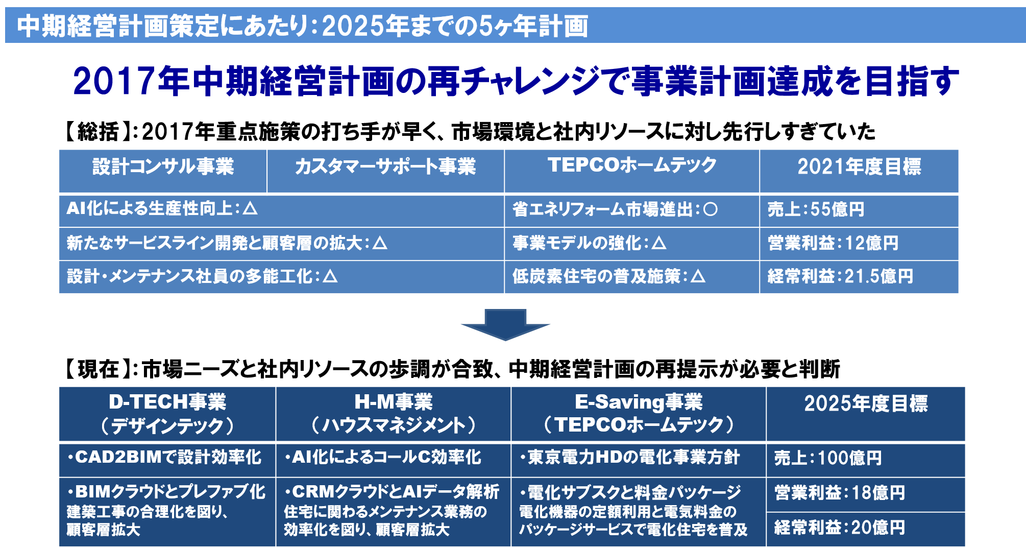 前回策定の中期経営計画は一言でいうと、重点施策も絞り切れておらず打ち手も早すぎて、市場ニーズと社内リソースに対し先行しすぎていたと分析しております。