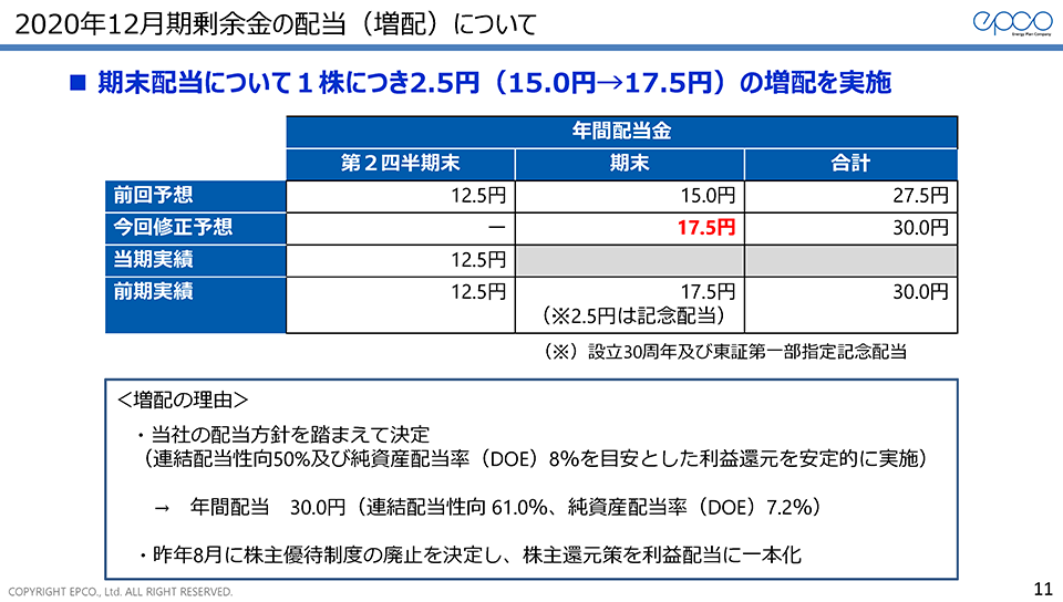 中期経営計画2021 2021.2.16 Tue エプコの中期経営計画を詳細解説-4 配当実績 エプコの配当方針は現在および今後の事業収益を基に、将来の事業展開や経営環境の変化に対応するために必要な内部留保などを総合的に勘案し、連結配当性向50%及び純資産配当率(DOE)8%を目安とした利益還元を安定的に実施するとしております。 また、2020年8月に株主優待制度を廃止した際に、株主還元策を利益配当に一本化したことから今回の増配を決定いたしました。 今後も事業環境に応じた適切な配当を実施してまいります。
