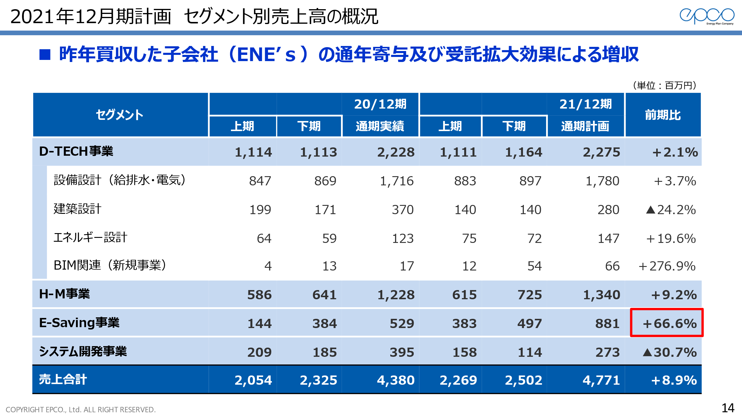E-Saving事業の売上は、8億8,100万円(前期比+66.6%)、営業利益3,600万円(前期比+168.2%)で計画しております。TEPCOホームテックとの工事連携強化により受託増加を見込んでおります。