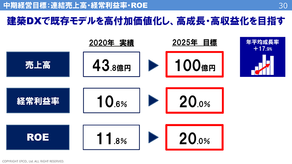 今回策定しました2025年を最終年とする中期経営計画では、2020年実績と比較して、売上高2.3倍(年平均成長率17.9%)、経常利益率+9.4P、ROE+8.2Pを目標にしており、建築DXで既存事業をベースに高付加価値化することで、筋肉質の企業体質への転換を目論んでおります。