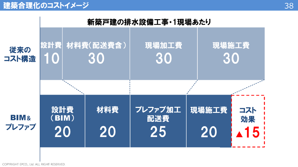 一方で、BIMクラウドと排水プレファブ化によるコスト構造は、BIMによる3次元設計費で付加価値が向上するため従来比で増加しますが、その他は効率が良い工場での配管加工と商流の短絡化ならびにプレファブ配管による施工の簡略化の効果で、排水設備工事全体としては15%のコスト合理化が図れるのではと試算しております。