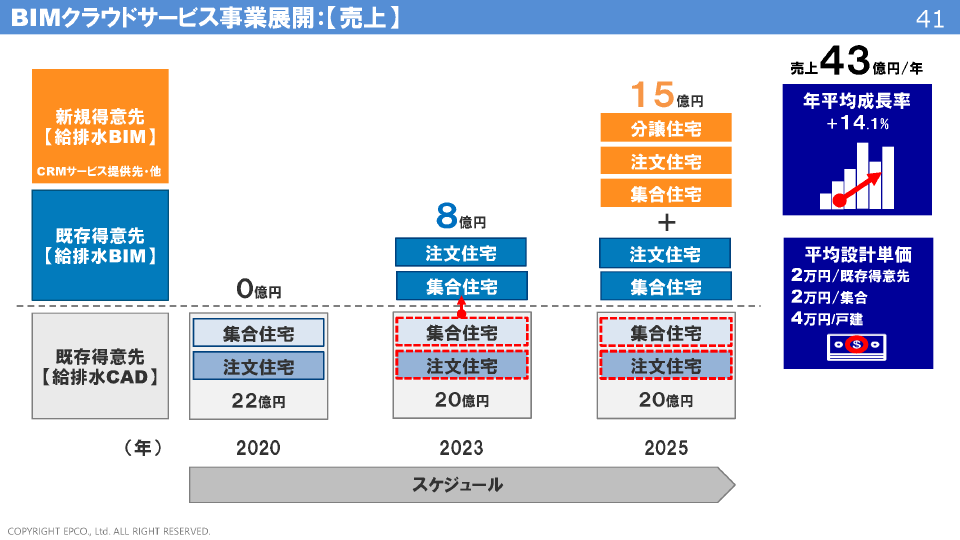 一方で、既存得意先から受託している設備設計の50%(約40,000戸)を、BIMクラウドサービスに切り替える計画でおり、BIMクラウドよるセールスミックス効果で8億円の増収を見込んでおります。