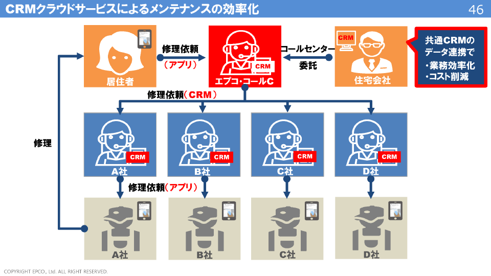 このようにデジタル技術を活用することで、エプコが提供するコールセンターサービスから、居住者・住宅会社・修理会社までのメンテナンス関係者全体をつなぐ、CRMプラットフォームサービスへの進化を図ってまいります。