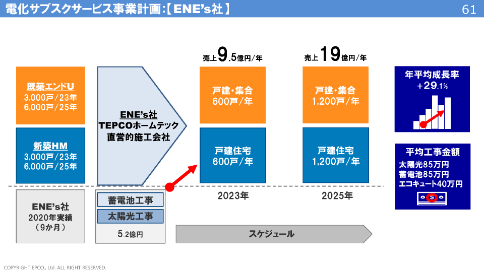 ENE’s社の2020年の9か月間の売上高は5.2億円でしたが、2025年にはTEPCOホームテック受注分の20%の工事受託を計画しており、売上高は19億円の達成を目指してまいります。