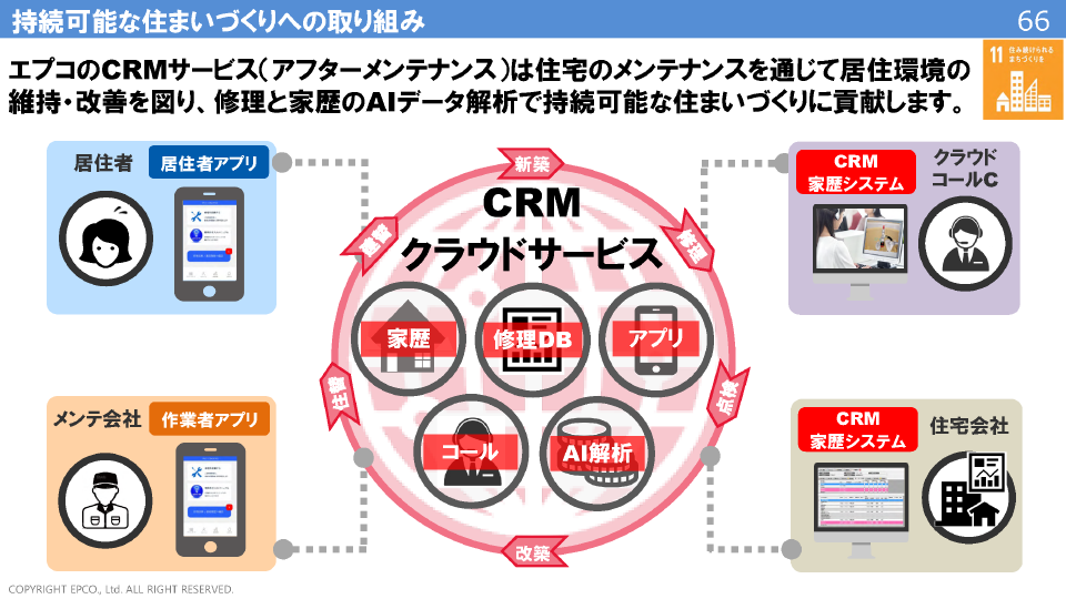 エプコグループの事業は住宅領域ですので、建築工事に関わる産業廃棄物の削減と省エネ電化住宅の普及によるカーボンニュートラル、そして、アフターメンテナンスを通じた持続可能な住まいづくりに、貢献してまいります。