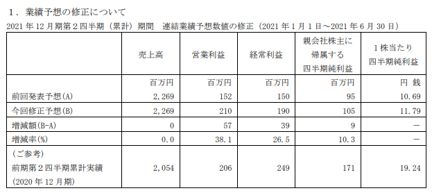 (参考)2021年12月期 第2四半期(累計)期間 業績予想の修正に関するお知らせ