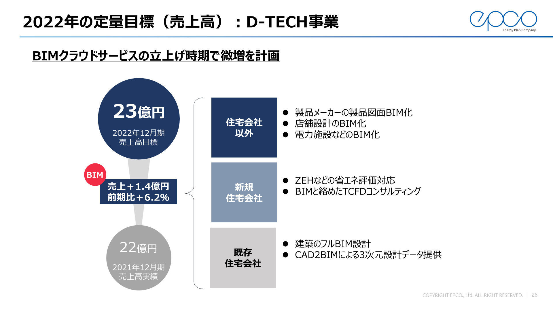 2022年におけるD-TECH事業部の事業計画は、BIMクラウドサービスの立上げ時期ということもあり、売上高は前期比+1.4億円、6%強の増収で計画しております。