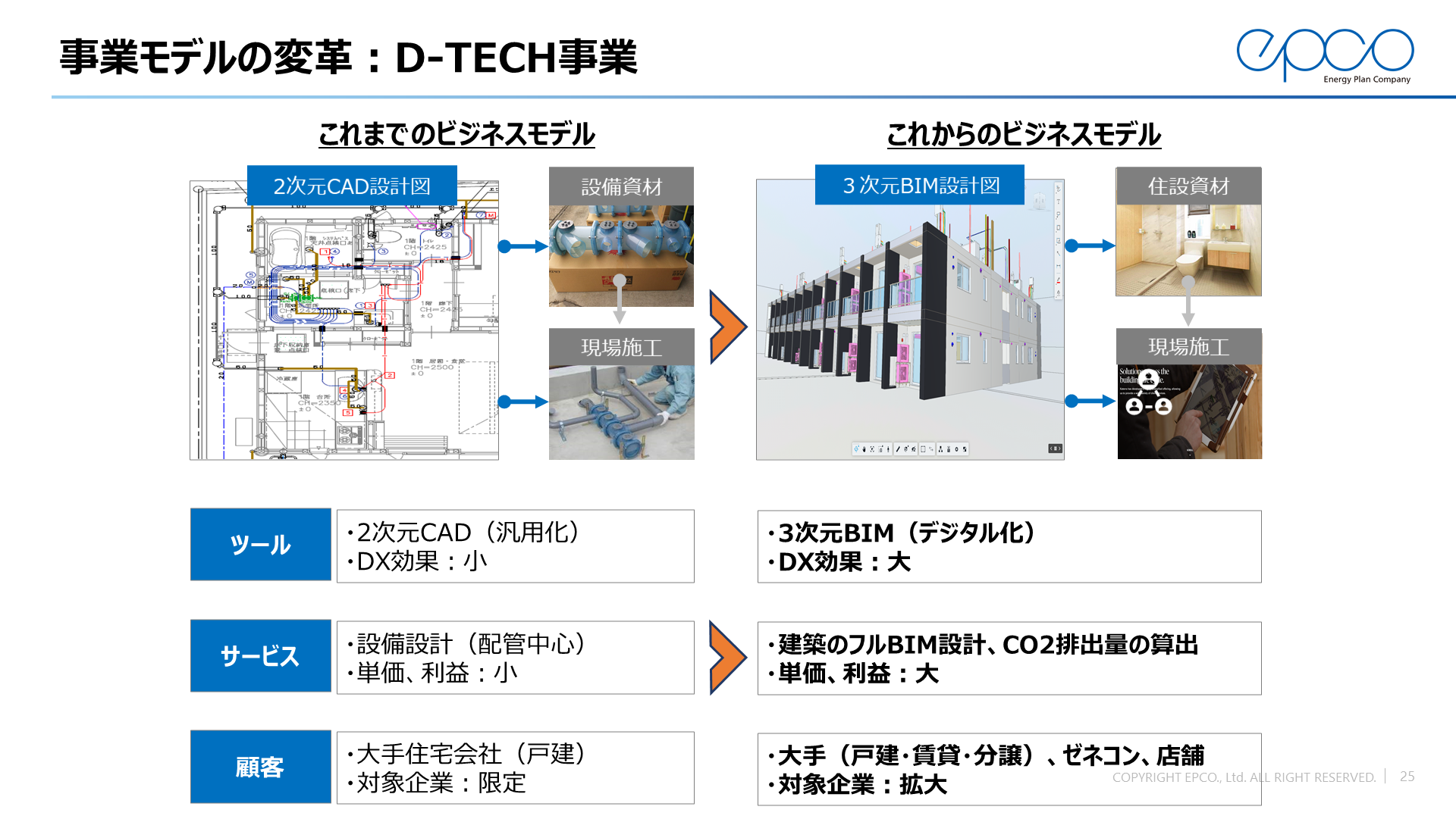 エプコグループが脱炭素化とデジタル化で、住宅分野のESG支援事業を展開するにおいて、これまでのビジネスモデルがどのように変革されて、いかに付加価値が高まるのかについて、各事業部別に、ご紹介させていただきます。まず、D-TECH事業部からご説明いたします。