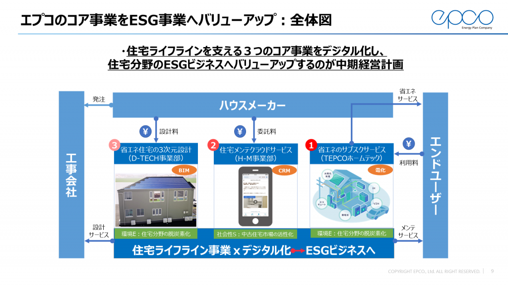 東京電力エネジーパートナーとエプコの合弁会社であるTEPCOホームテックを通じた省エネ事業を展開しており、太陽光発電や蓄電池、EV充電器などの省エネ・再エネ機器をサブスクモデルで提供するエネカリサービスを手掛けております。