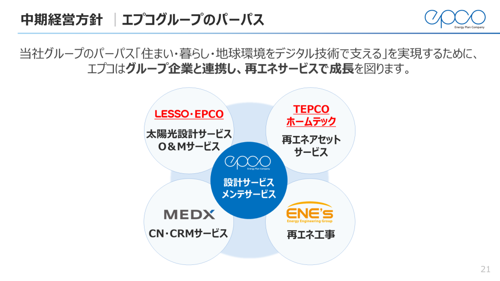 これまでエプコは、ベース事業(設計及びメンテナンスサービス)にて、大手住宅会社向けに新築時の設備設計及び引き渡し後のメンテナンス対応サービスを実施することで、安定的な成長を果たしてまいりました。そうした中、現在は事業ポートフォリオの移行期であり、ベース事業で培った様々なノウハウを活かして、成長事業である再エネサービス(事業領域:太陽光発電・蓄電池・EV等)に対して経営資源を優先的に投入しております。
