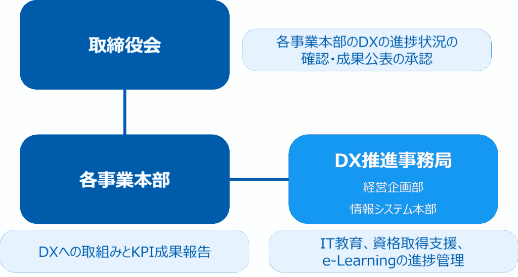 また、各部門はDXを推進とその成果報告、取締役会においては各部のDXの進捗状況の確認、成果公表の承認を行います。