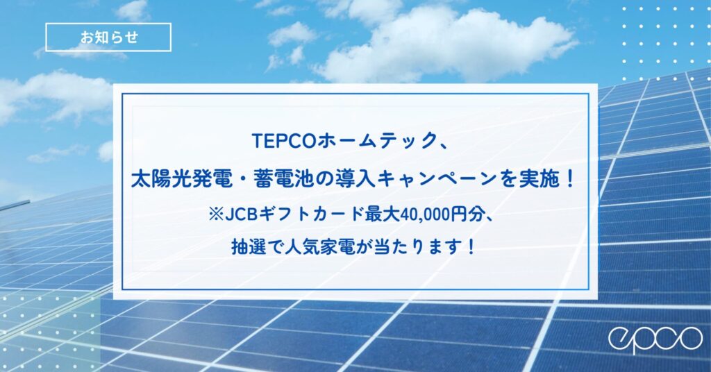 TEPCOホームテック、太陽光発電・蓄電池の導入で、 JCBギフトカード最大40,000円分進呈、抽選で人気家電が当たるキャンペーンを開催