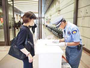 一人一人氏名を言って入館バッジを受け取ります。