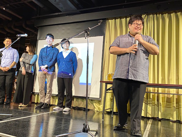 2019年に入社したばかりの新卒メンバーによって会は幕を開けました。大勢の前でのあいさつということで普通は緊張しそうなものですが、リラックスした笑顔が見られました。素敵!
