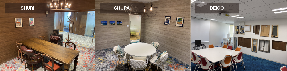 会議室は海や船、エプコに関係するオブジェクトなどをモチーフにデザインされています。会議室名は「SHURI」「CHURA」「DEIGO」など沖縄に関係する言葉で名付けがされています。