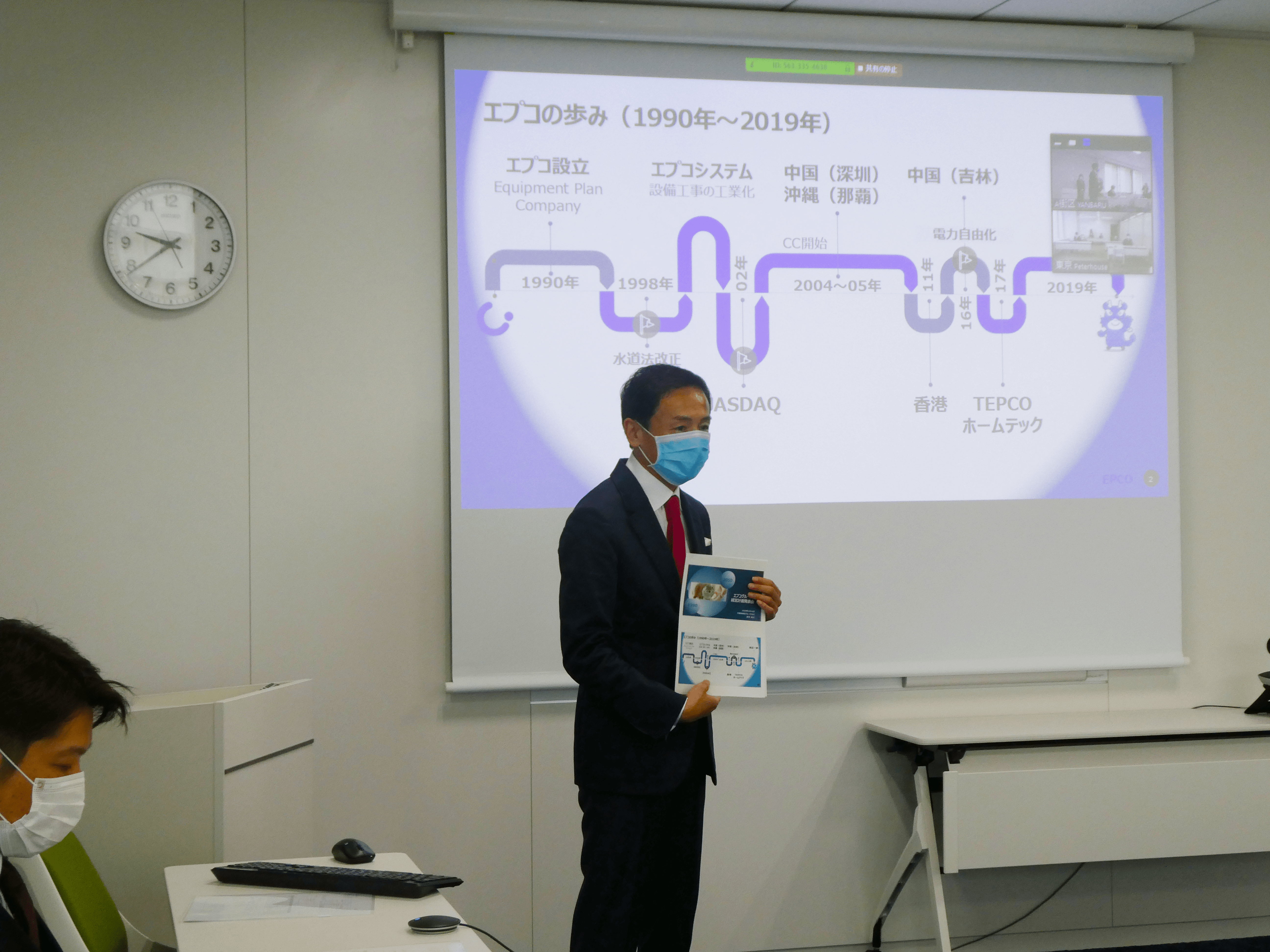 エプコはこれまで沖縄・東京どちらかで入社式を執り行ってきましたが、今年は新型コロナウィルス感染症防止の観点から東京・沖縄間でZoom(Web会議)をつなぎ入社式を行いました。