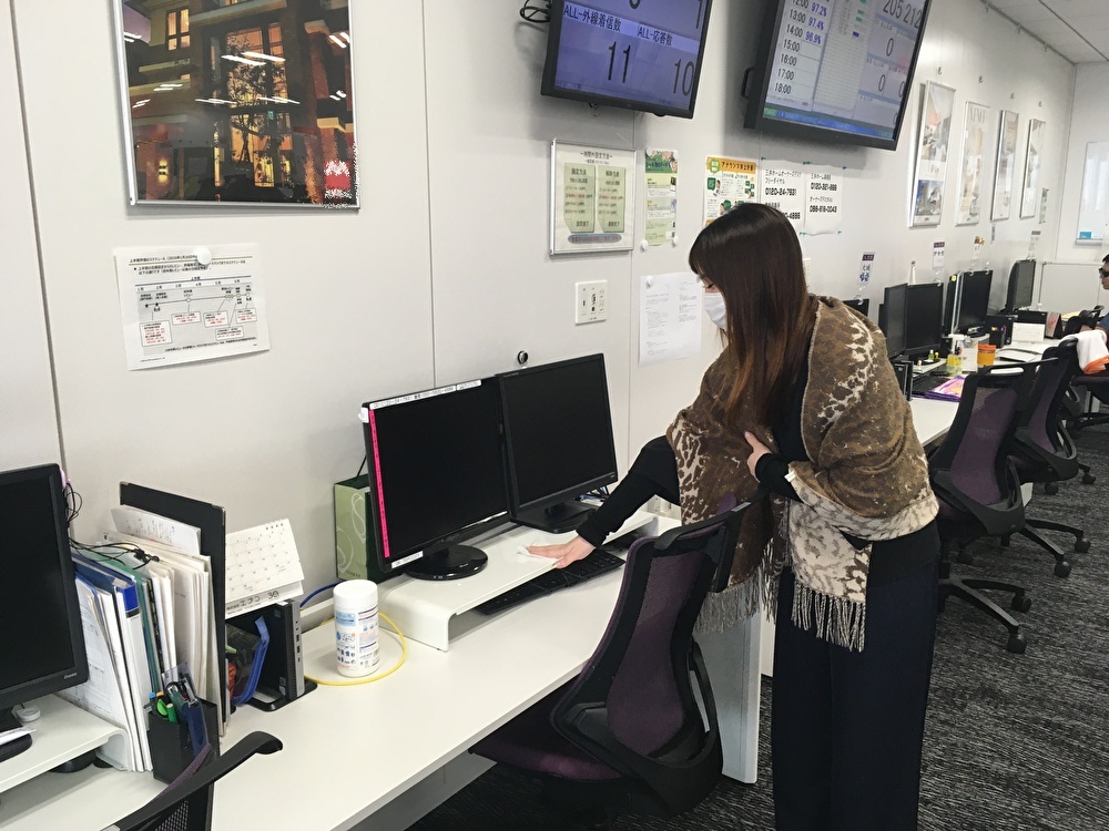 執務室内の環境を保つため、出社時及び退社時にアルコールや除菌ペーパーを用い、机と周辺の除菌を徹底しています。