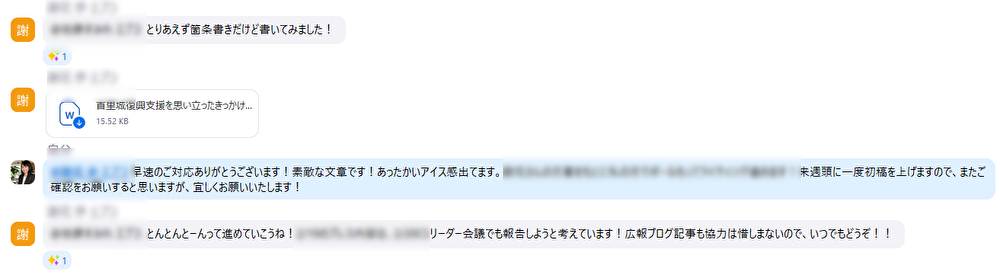 広報ブログチーム内でのチャットワークの様子。スタンプや反応を早めに行うようにしています。