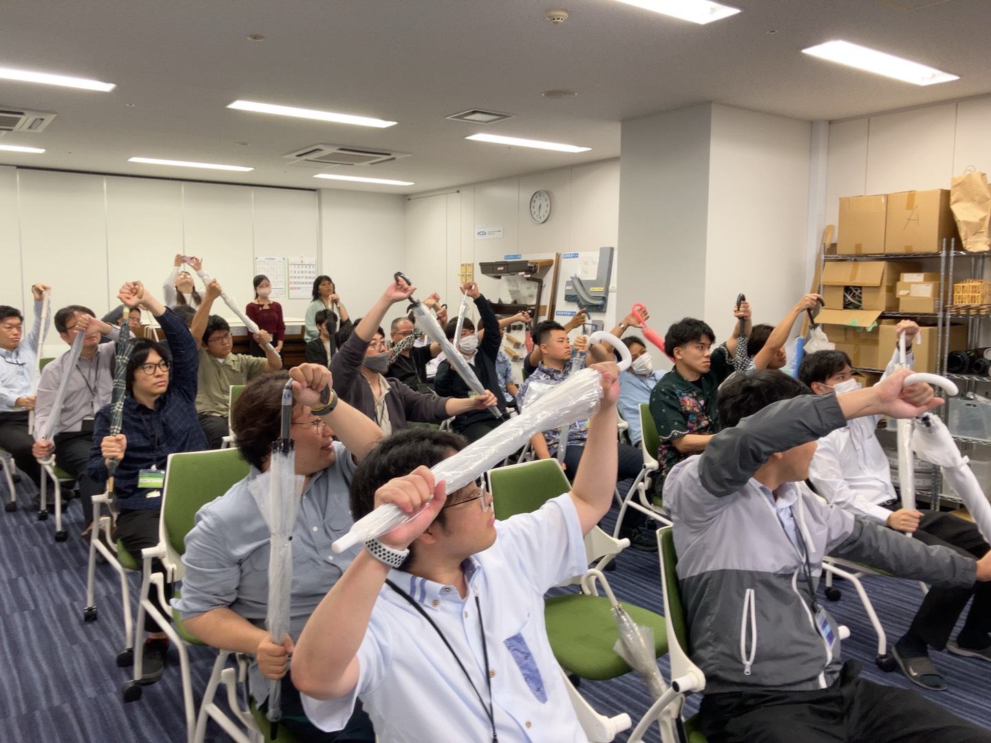 ▲オフィスでの練習会の様子。傘を櫂に見立て、呼吸合わせを行いました。