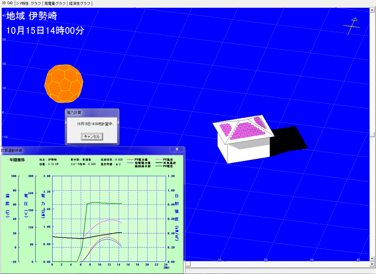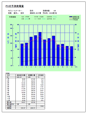 設置条件(設置面・搭載容量・屋根勾配・建築地・方位)を入力して発電シミュレーションを行い、予測発電量の結果を出します。
